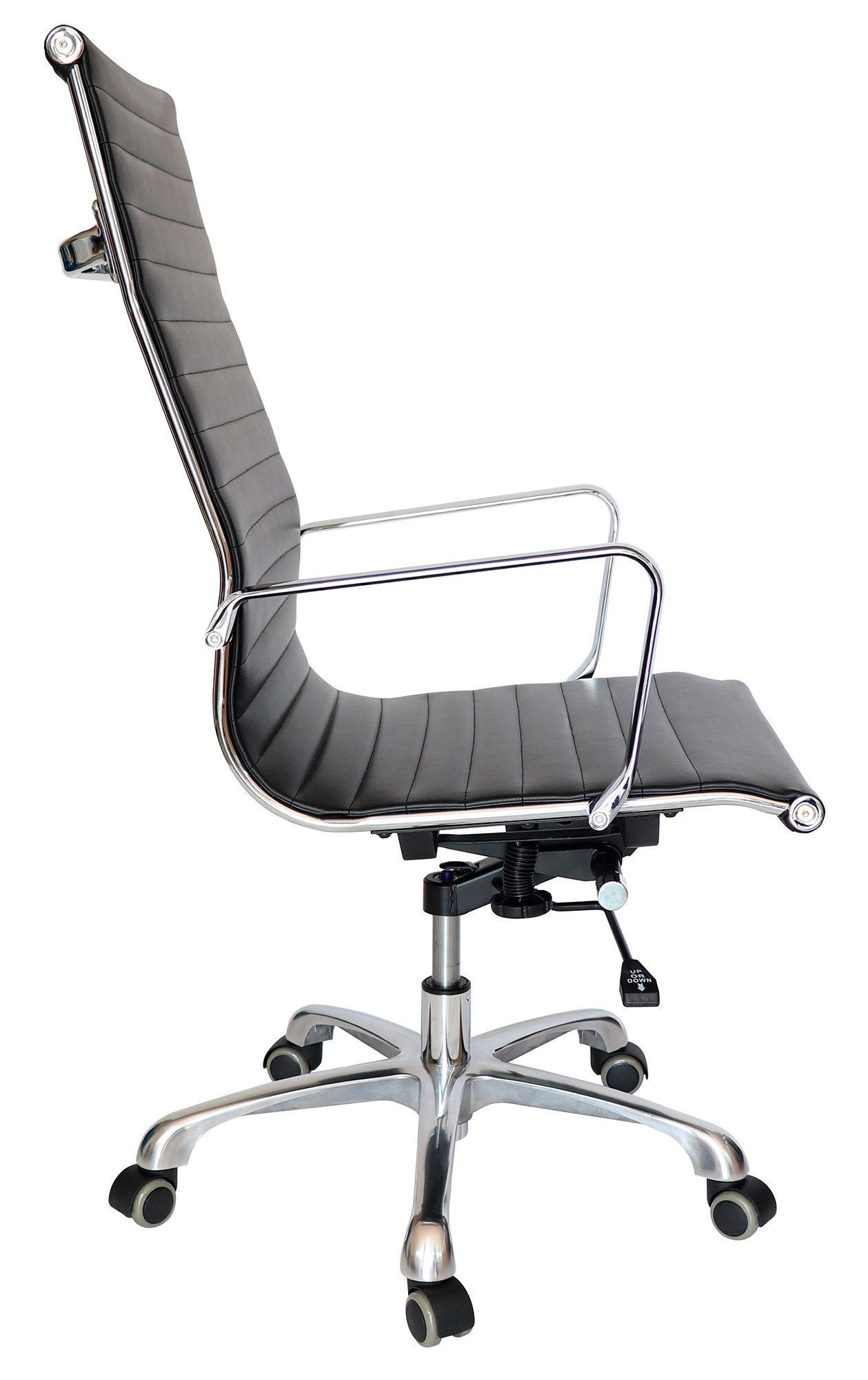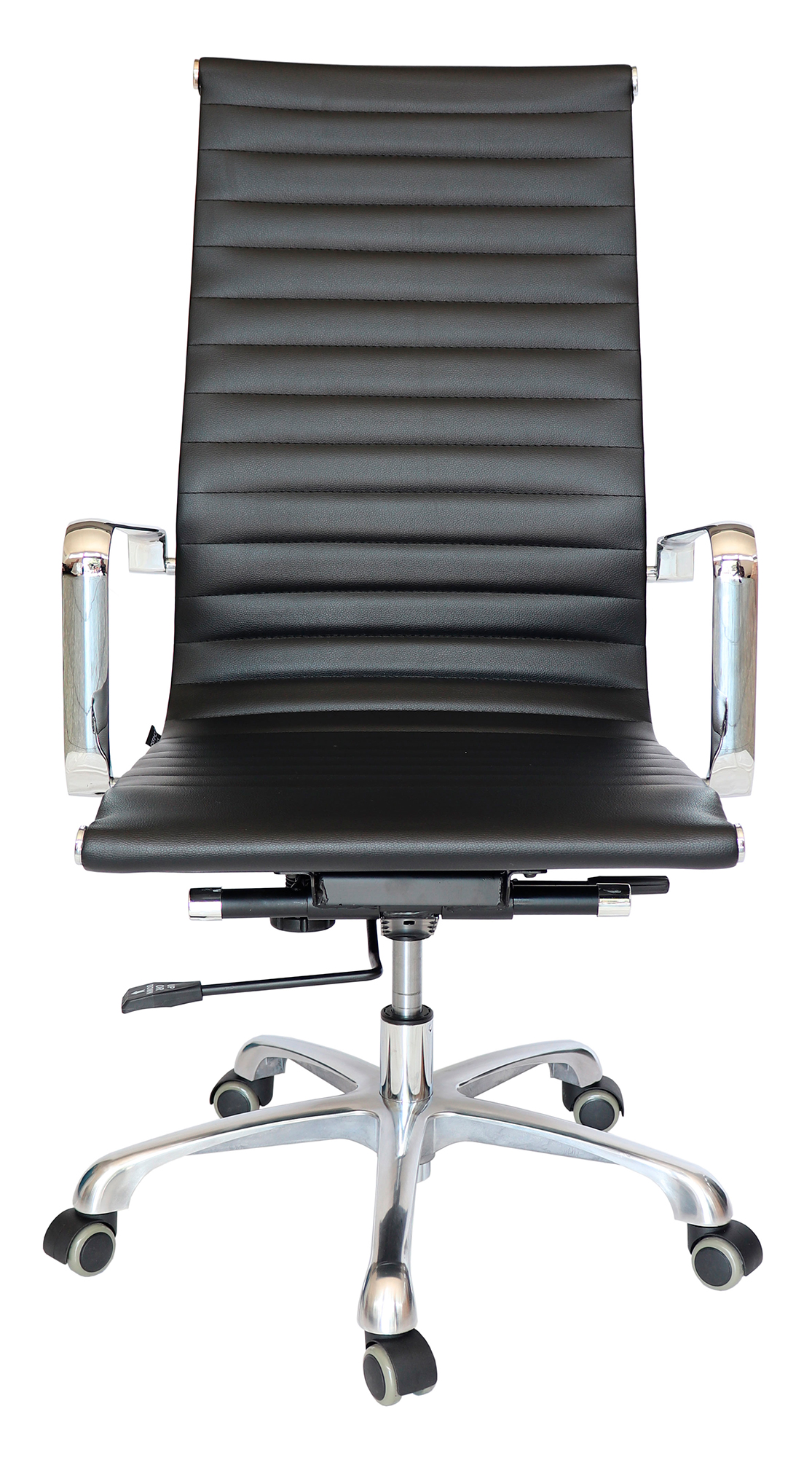 Asiento y respaldo: Alto de un sólo corte tensado con la estructura para dar una suspensión única y adaptarse al cuerpo, tapizado en soft revolving leather acojinado con hule espuma laminada flexible con densidad de 17 kgs/m³ y alta resiliencia; toda la estructura es de acero tubular con terminado en cromo.