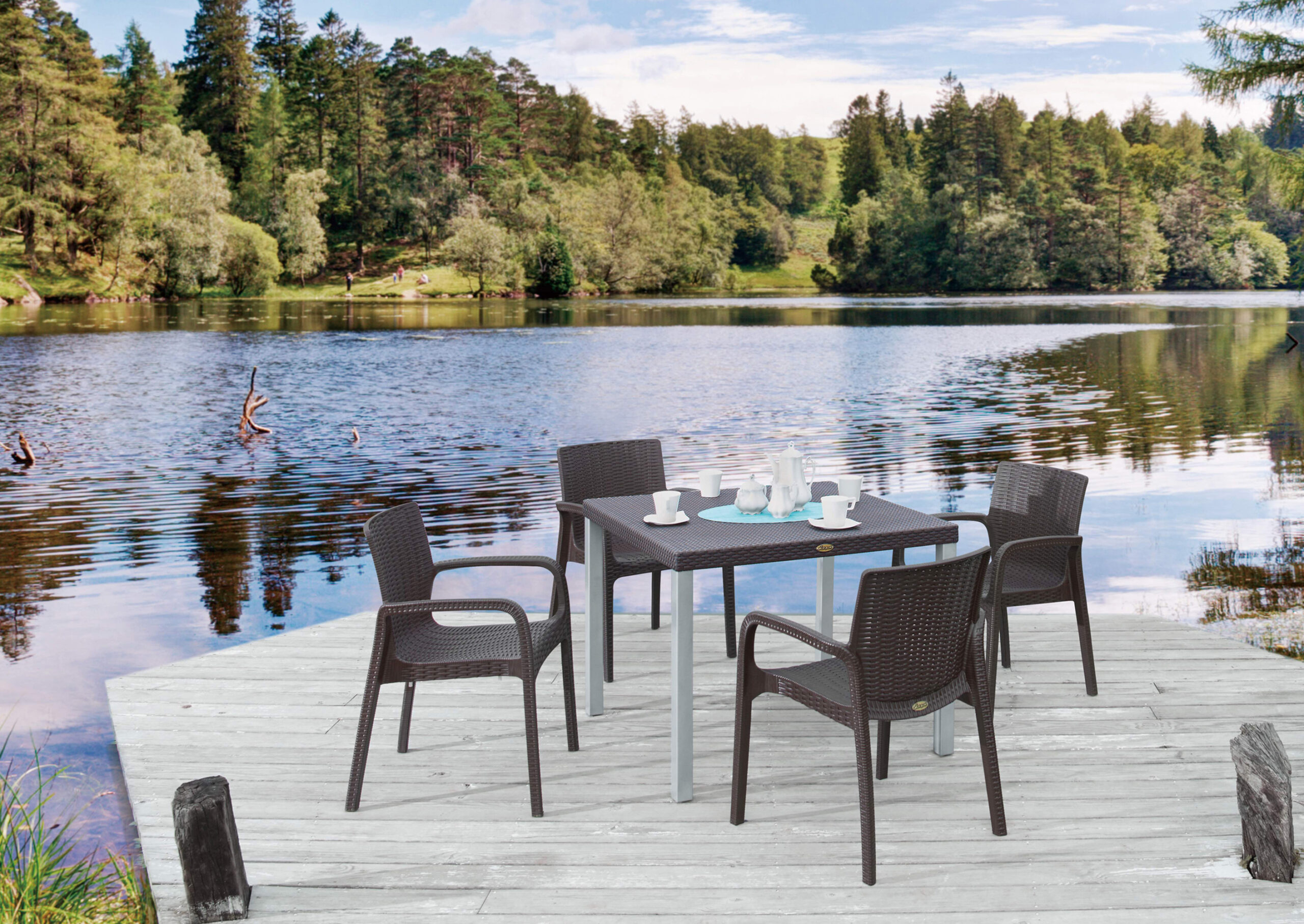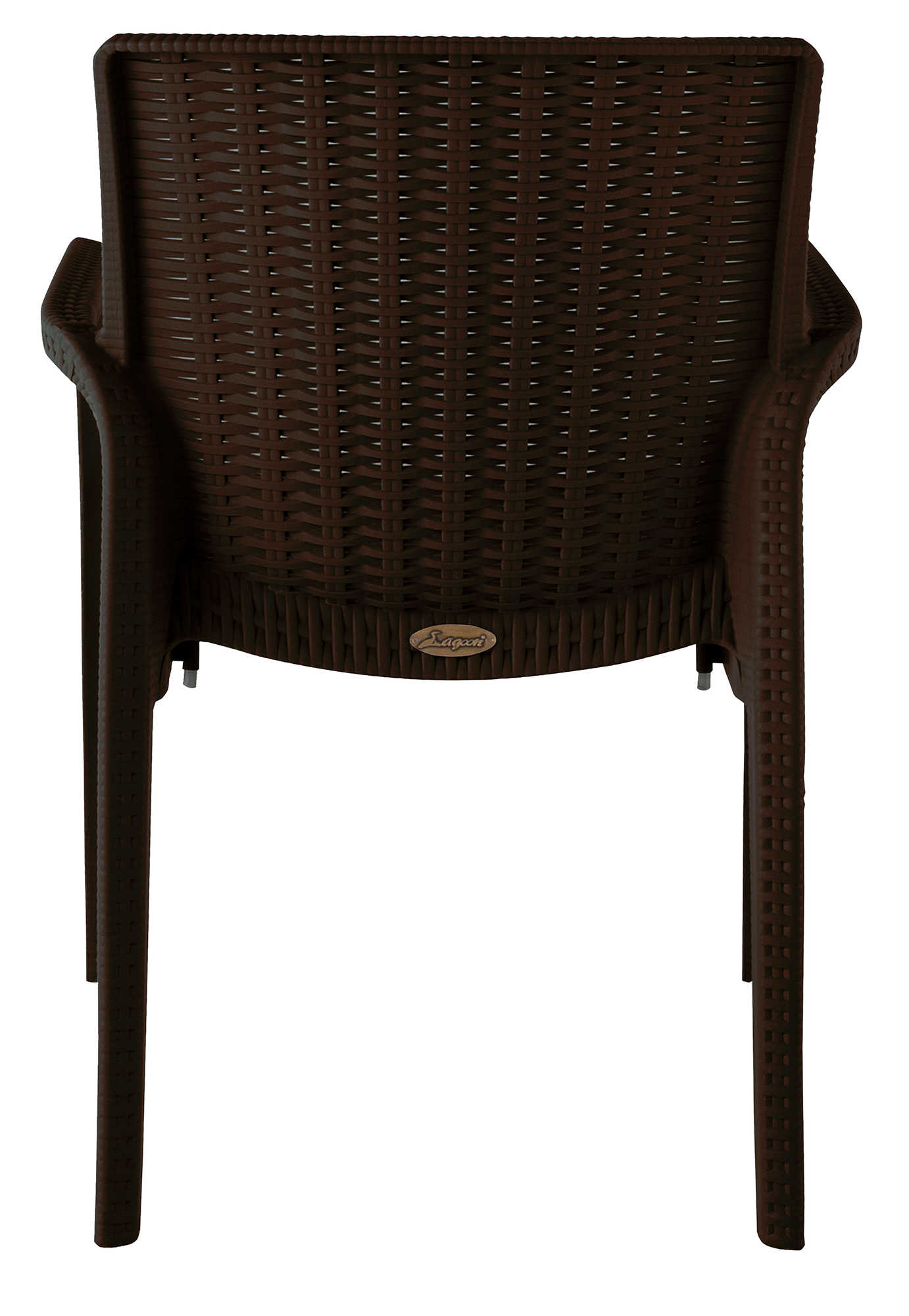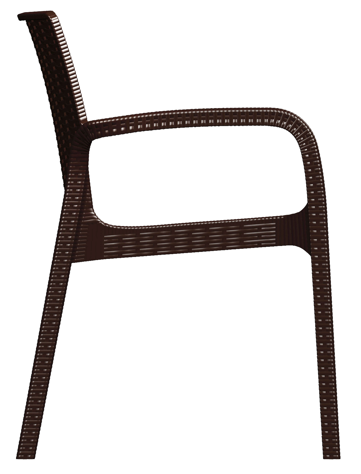 Respaldo, asiento y patas: terminado en imitación mimbre de una sola pieza en polipropileno de alta resistencia y duración para intemperie, resistente a los rayos ultravioleta (UV) y al ambiente salino.