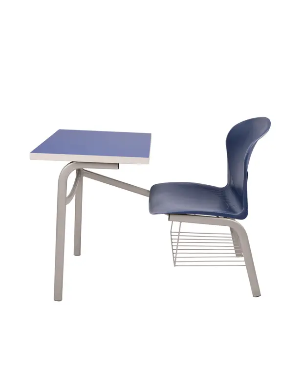 Mesabanco Capri de polipropileno color azul con cuatro patas y terminación de estructura de color gris, y canastilla incluida y material de paleta cubierta de Blowmolding.