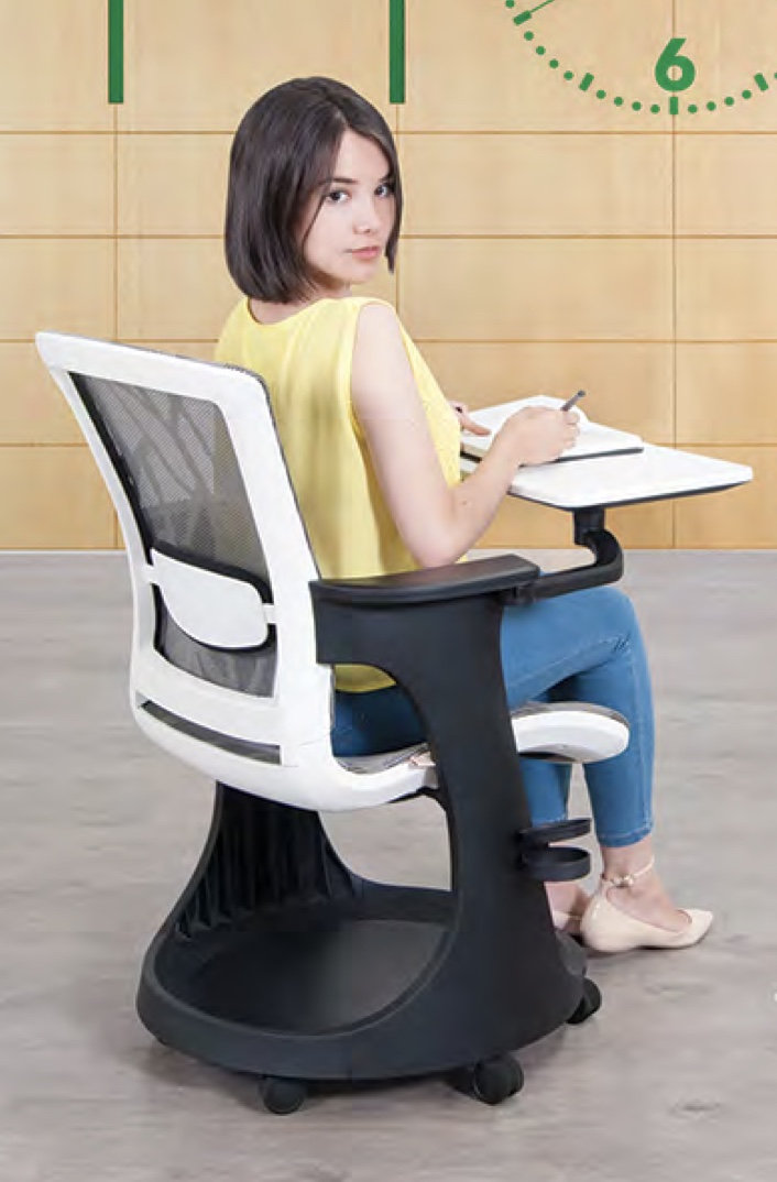 Pupitre Flux móvil con altura de 17,5”, estructura con base móvil, fabricado en polipropileno, asiento de malla y ensamble con tornillos. La paleta giratoria está cubierta de polipropileno.