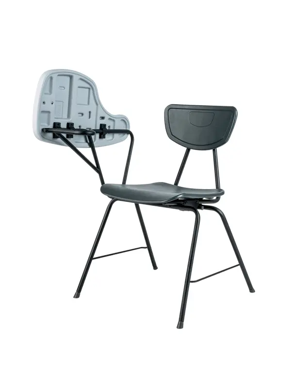 Sin canastilla: Pupitre Pia de cuatro patas con tubo redondo de 3/4″ pintado, incluida sus regatones de plástico. Paleta cubierta de BLOWMOLDING 28mm y su respaldo y asiento de polipropileno color gris oscuro. *(PORTA PALETA DESMOLDABLE)