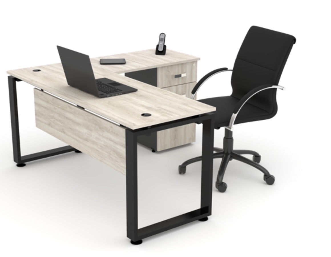 Escritorio Quadra con lateral (der./izq.). Escritorio recto fabricado en melamina con acabado en los cantos en PVC de 1 mm, patas metálicas en perfil tubular rectangular calibre 18 con ensambles a 45°, acabado en pintura electrostática color blanco o gris, y niveladores.