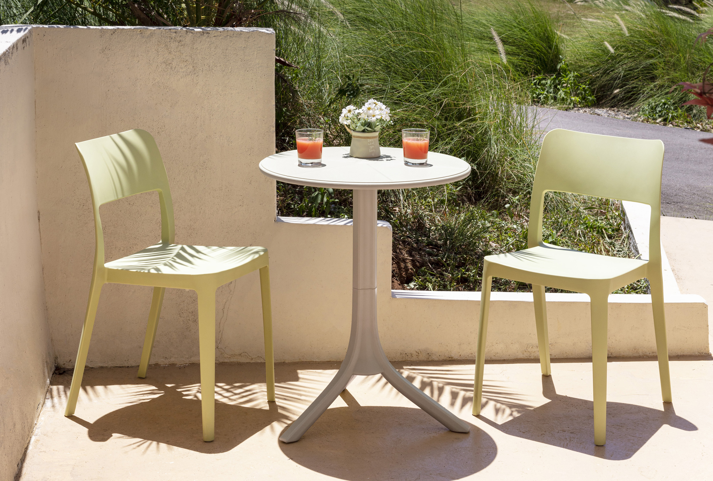 Mesa: en polipropileno de alta resistencia y duración para intemperie e interior, resistente a los rayos ultravioleta (UV) y al ambiente salino; ajustable en dos alturas.