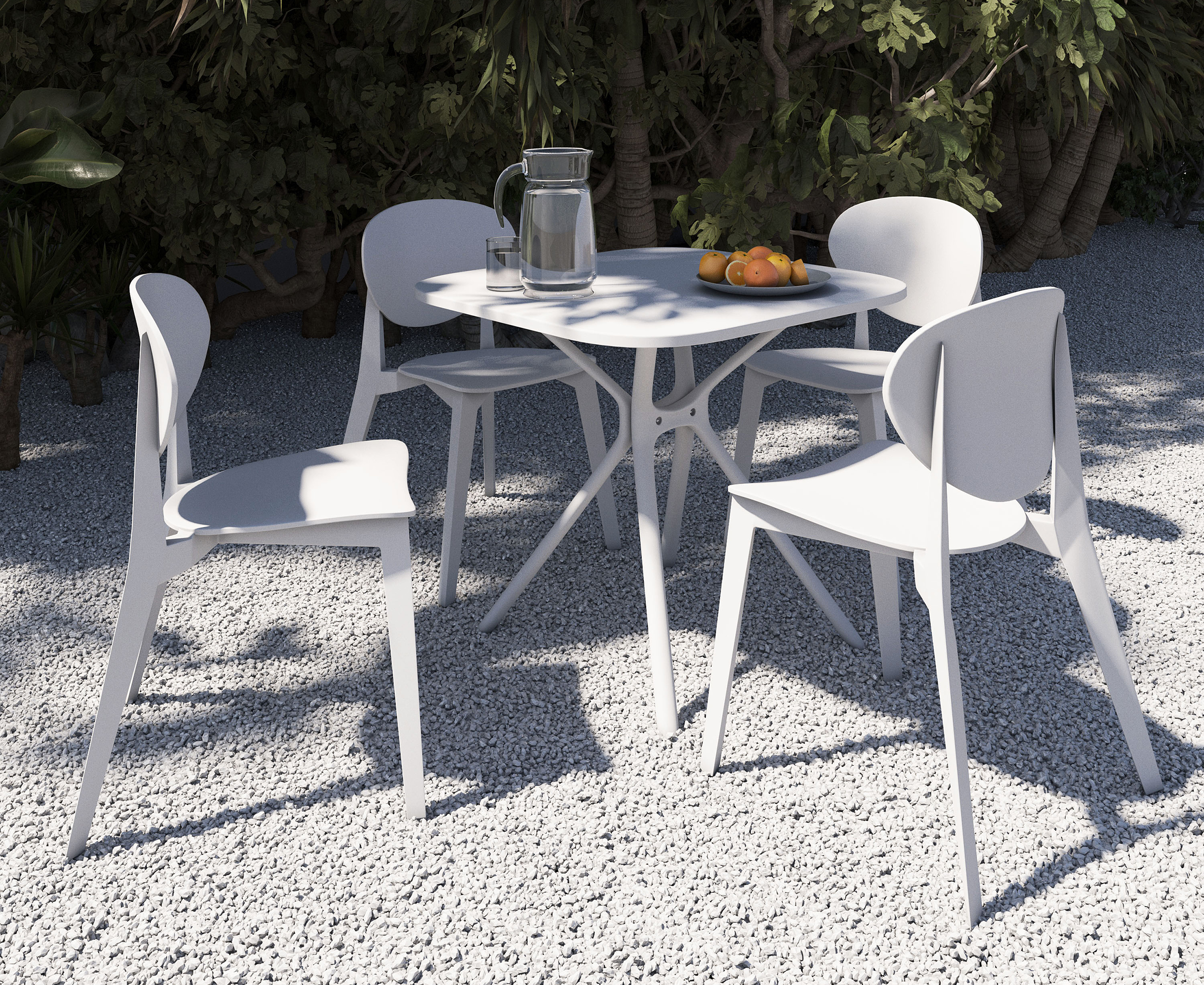 Mesa: en termoplástico polimerizado de polipropileno para intemperie e interior, resistente a los rayos ultravioleta (UV), al ambiente salino, a los cambios bruscos de temperatura y a corrosión de ácidos alcalinos; es inocuo y no guarda aromas.