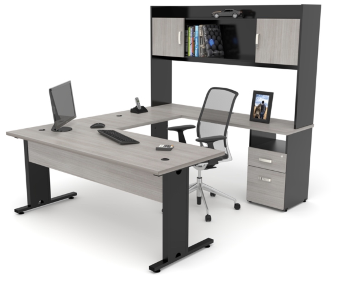 Conjunto ejecutivo Valka con librero sobreponer (der./izq.) escritorio recto fabricado en melamina con acabado en los cantos en PVC de 1 mm, patas metálicas base con sistema para ocultar el cableado, faldón melamínico, terminado en pintura electrostática color negro o gris y niveladores.